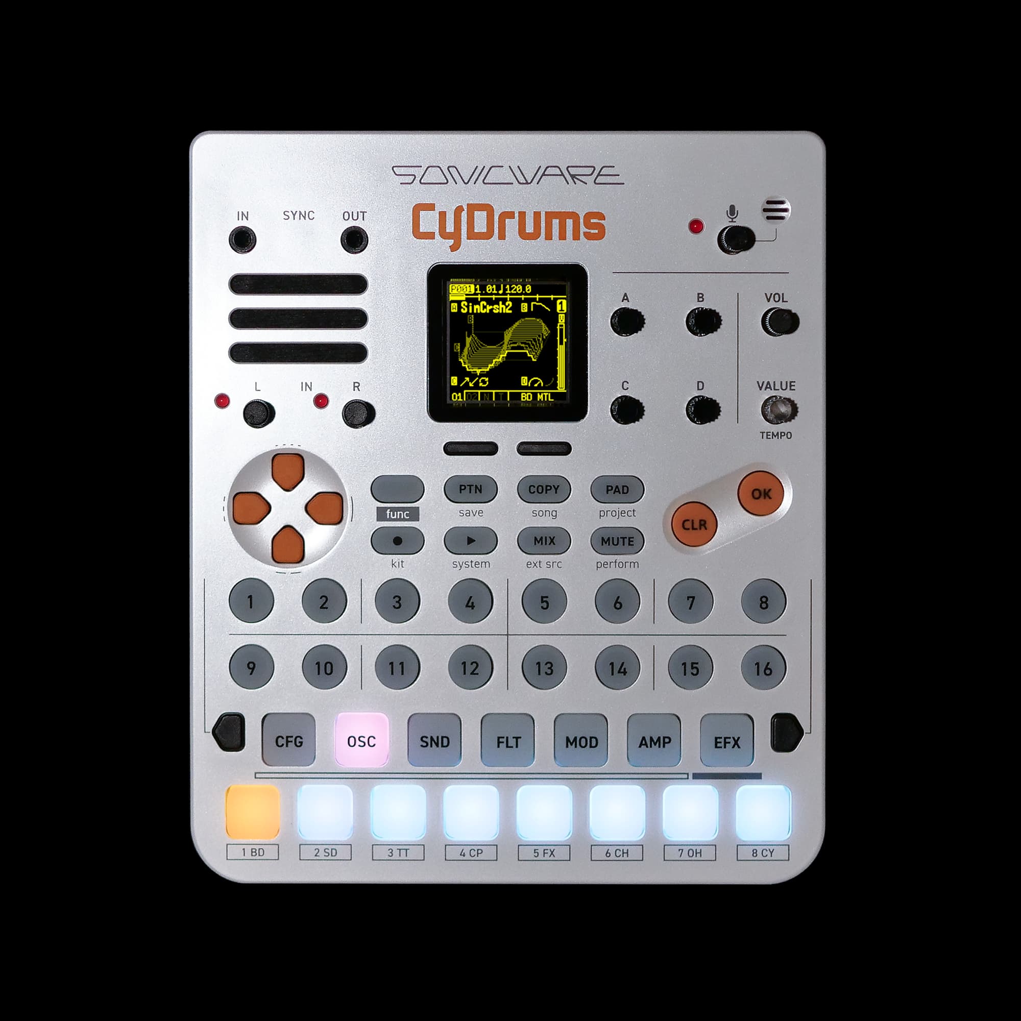 CyDrums boasts a powerful 8-track, 128-step sequencer based on the acclaimed workflow of the Lofi-12 XT. Unlock the freedom to experiment with odd time signatures and evolving polyrhythms.
