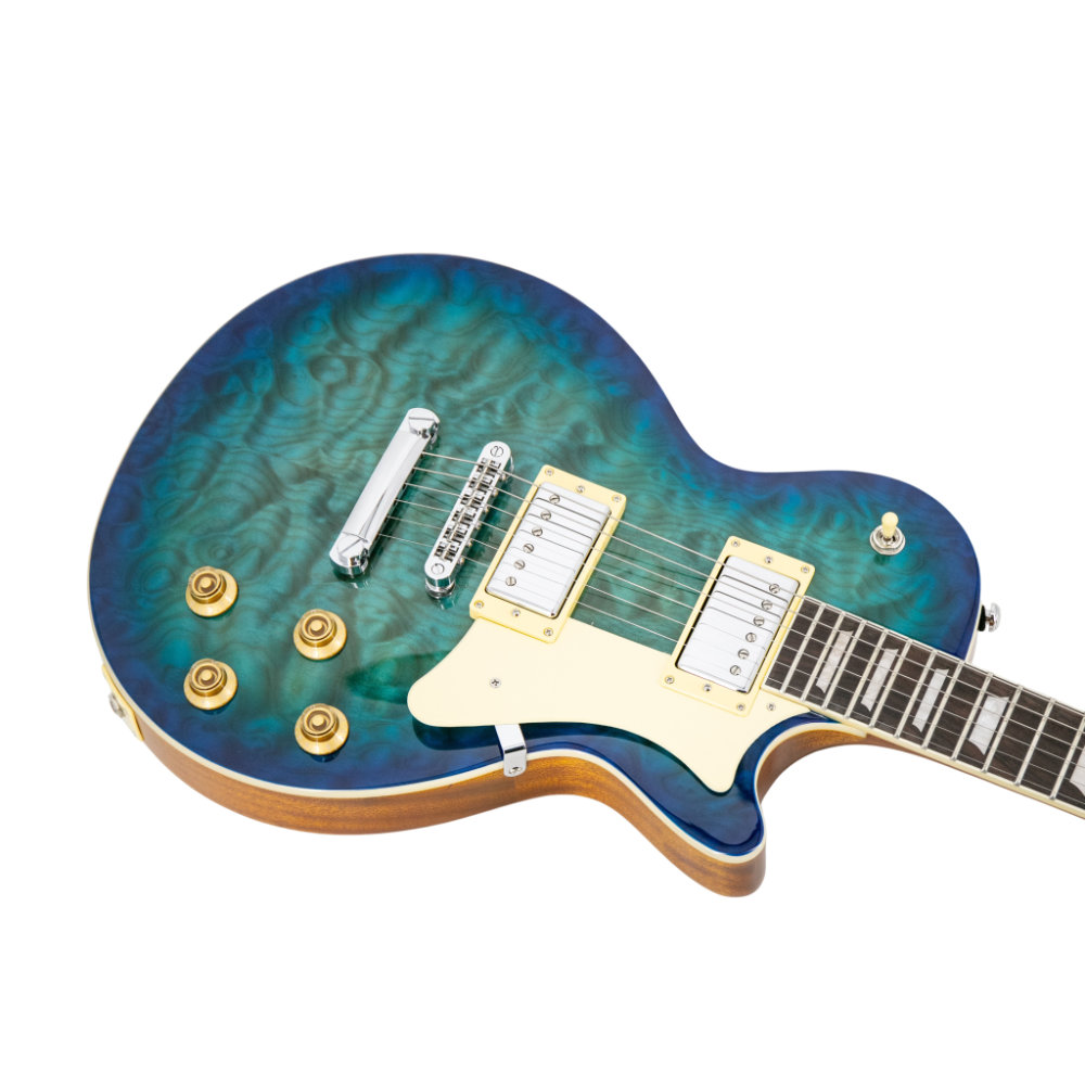 Die Heritage Ascent+ Collection H-150 wurde für Musiker entwickelt, die maximale Vielseitigkeit und unverwechselbaren Stil suchen. Sie ist mit einer geflammten oder quilted Ahorndecke sowie einem massiven Mahagoni-Korpus ausgestattet. Diese Kombination sorgt nicht nur für eine edle Optik, sondern auch für einen warmen, durchsetzungsstarken Klang. Dank der Push-Pull-Coil-Split-Funktion lässt sich der Sound im Handumdrehen von kraftvollen Humbucker-Tönen zu brillanten, artikulierten Single-Coil-Sounds wechseln.